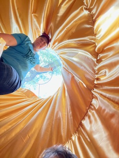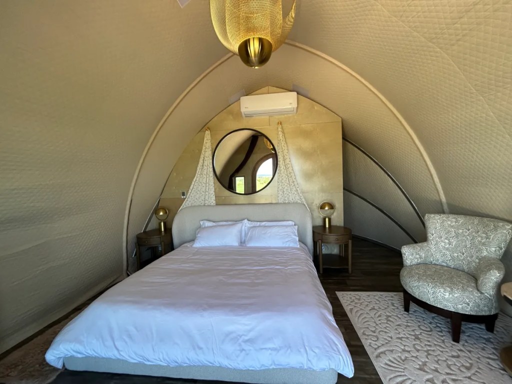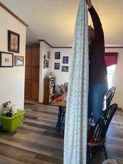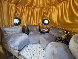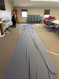 Gray Ceiling drapes for Meander Restaurant & draperies for Danish tent room beds at Shortgrass Resort.